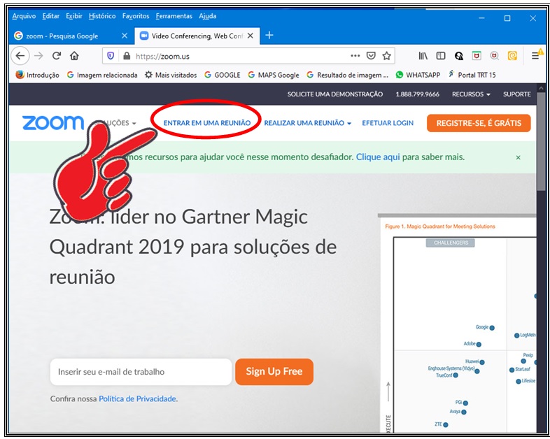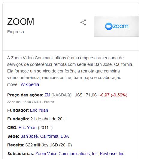 Uma plataforma que é atualmente muito popular chama-se ZOOM (pronuncia-se ZUM por que é americana) e sua popularidade se deve ao fato de não apresentar limitações de número de participantes limitando-se apenas ao item duração da reunião na alternativa gratuita, limitando o evento em 40 minutos. Então para reuniões rápidas, até 40 minutos, é a plataforma ideal por que é gratuíta. Veja as credenciais apresentadas pela ZOOM: