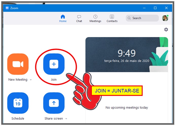 Vai aparecer a tela inicial do ZOOM com várias opções. Você deve selecionar JOIN:
