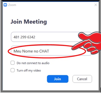 Não precisa ser o nome completo mas sim um nome que possa identificar você para os demais participantes da reunião. Num encontro nacional seria interessante colocar a sigla do estado e tambpém o nome do clube de uma forma abrevida porém indentificável. Procure não colocar um nome muito comprido pois este nome vai aparecer no CHAT ocupando parte do campo de texto.