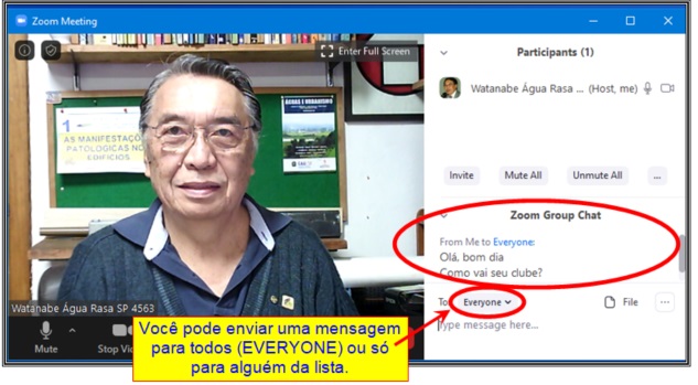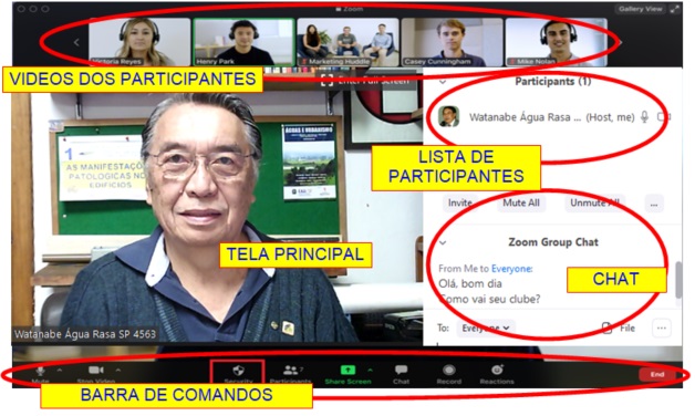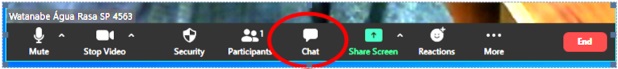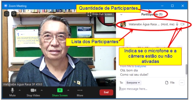 CHAT: Ativa ou Desativa o CHAT. Na Tela Principal em modo normal (não full-screen) é apresentada do lado direito da tela uma tira vertical contendo a lista de todos os participantes. Os nomes de cada um é aquele que cada um digitou quando entrou na reunião.
