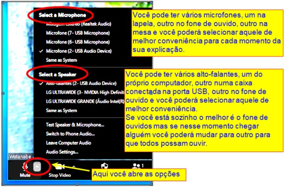 Ao lado do ícone do microfone, clicando na seta para cima será apresentada a lista de microfones que estão conectados ao computador