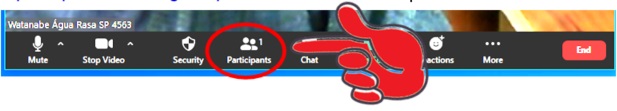 PARTICIPANTES: Ativa ou Desativa a Lista de Participantes. Na Tela Principal em modo normal (não full-screen) é apresentada do lado direito da tela uma tira vertical contendo a lista de todos os participantes. Os nomes de cada um é aquele que cada um digitou quando entrou na reunião.