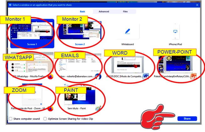 SHARE SCREEN será apresentada uma tela com todos os aplicativos abertos no seu