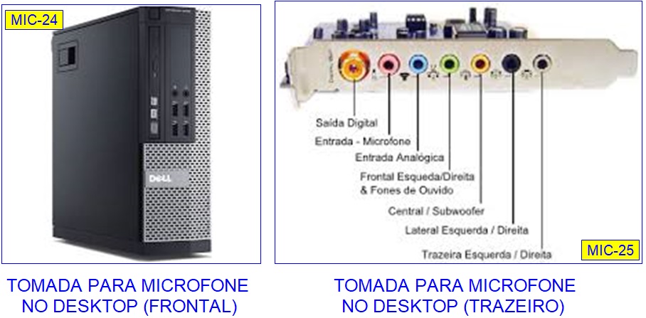 Nos desttop a tomada para o microfone pode estar localizada no painel frontal ou na traseira. Veja no Manual do Usuário o local e a especificação das entradas para microfone: