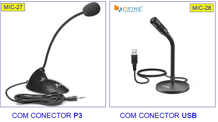 O microfone vem com um cabo que tem na ponta um conector para ligar no computador. Pode ser o conector P3 ou o conector USB.