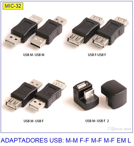 Existem muitos adaptadores com combinações diferentes de conectores USB MACHO e USB FÊMEA, combinações que podem ser M-M, F-F, M-F e F-M. Há até conectores USB em L o que é muito bom para monitores ou televisores instalados na parede pois não dobram o cabo.